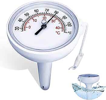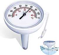 Its clear top-dial analog display floats neatly on the water surface, making temperature checks easy at a glance. Measuring in both °C and °F, it delivers reliable readings without batteries or electronics. A convenient tethering string keeps the thermometer securely in place, whether used in pools, spas, hot tubs, or water features.